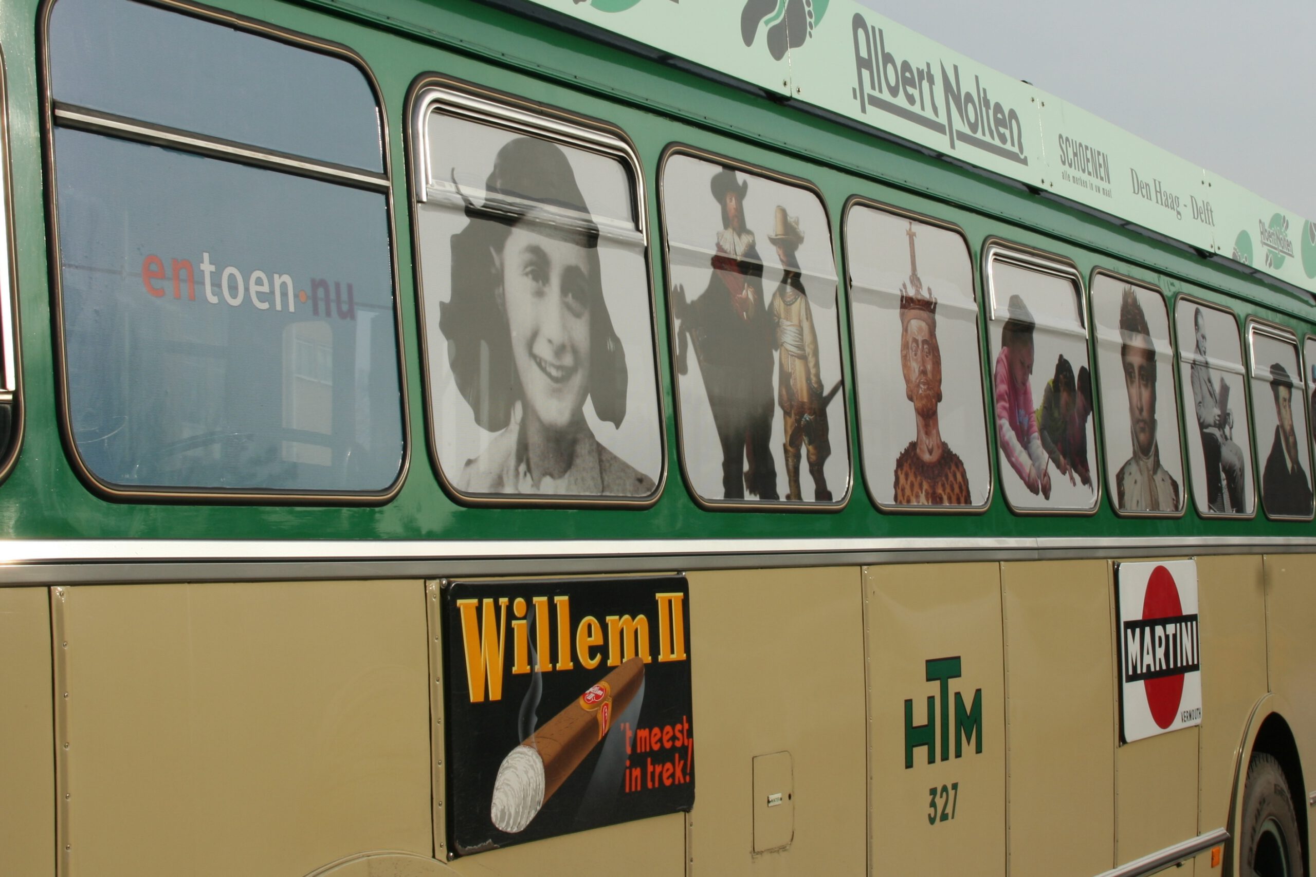 Bus HTM-327 voorzien van raamstickers voor het project en-toen-nu.